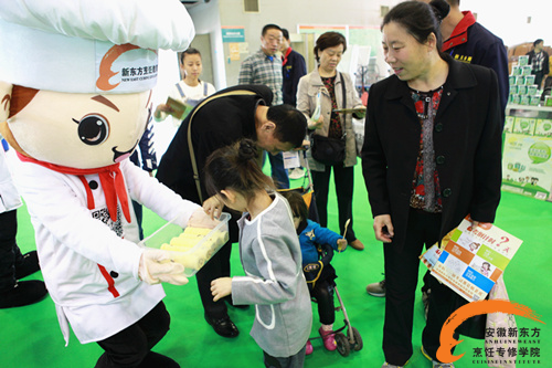 很多观众对西点的制作产生浓厚的兴趣,他们在安徽新东方学生的辅导下现场制作蛋糕,每一个前来体验的观众都开开心心的制作出了属于自己的蛋糕。新东方的吉祥物,小厨神也来到现场啦!他们把快乐和美味分享给大家!
